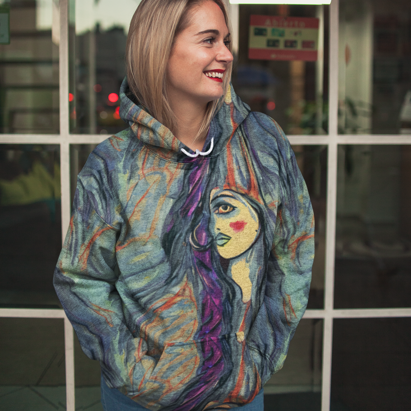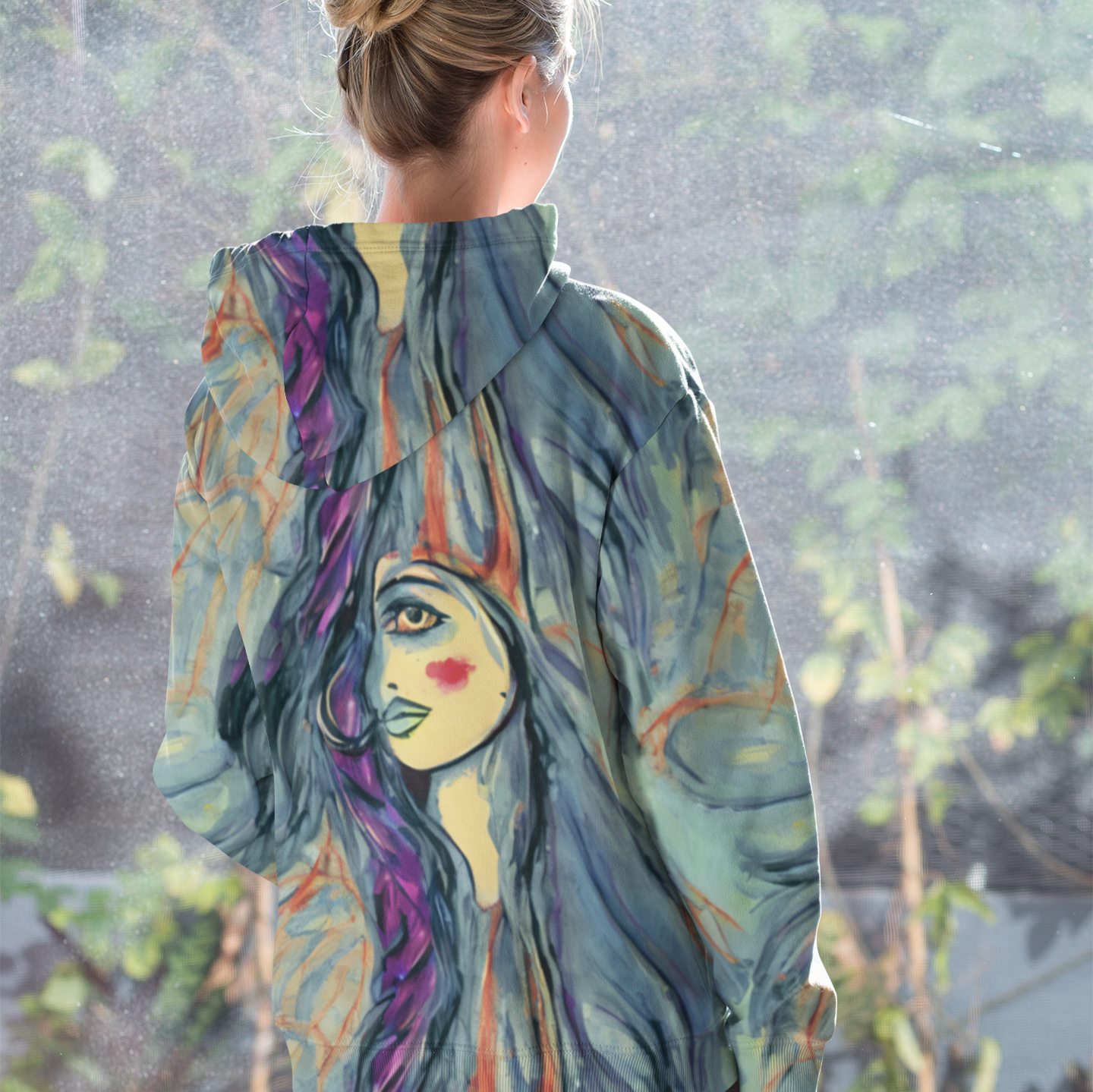 Wrap yourself in the cozy charm of the Slate Fog Boho Beach Hoodie, a perfect blend of comfort and bohemian style. This unisex hoodie features a misty slate fog pattern with a beautifully painted bohemian woman with flowing purple hair, adding an artistic touch that captures the spirit of beach days and cool evenings. The brushed fleece interior provides an incredibly soft and warm feel, making it ideal for layering on chilly days or lounging in comfort.